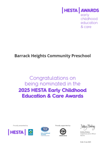 We are proud to share that Barrack Heights Community Preschool has been named a finalist in the 2025 HESTA Early Childhood Education & Care Awards, in the category of Outstanding Service.